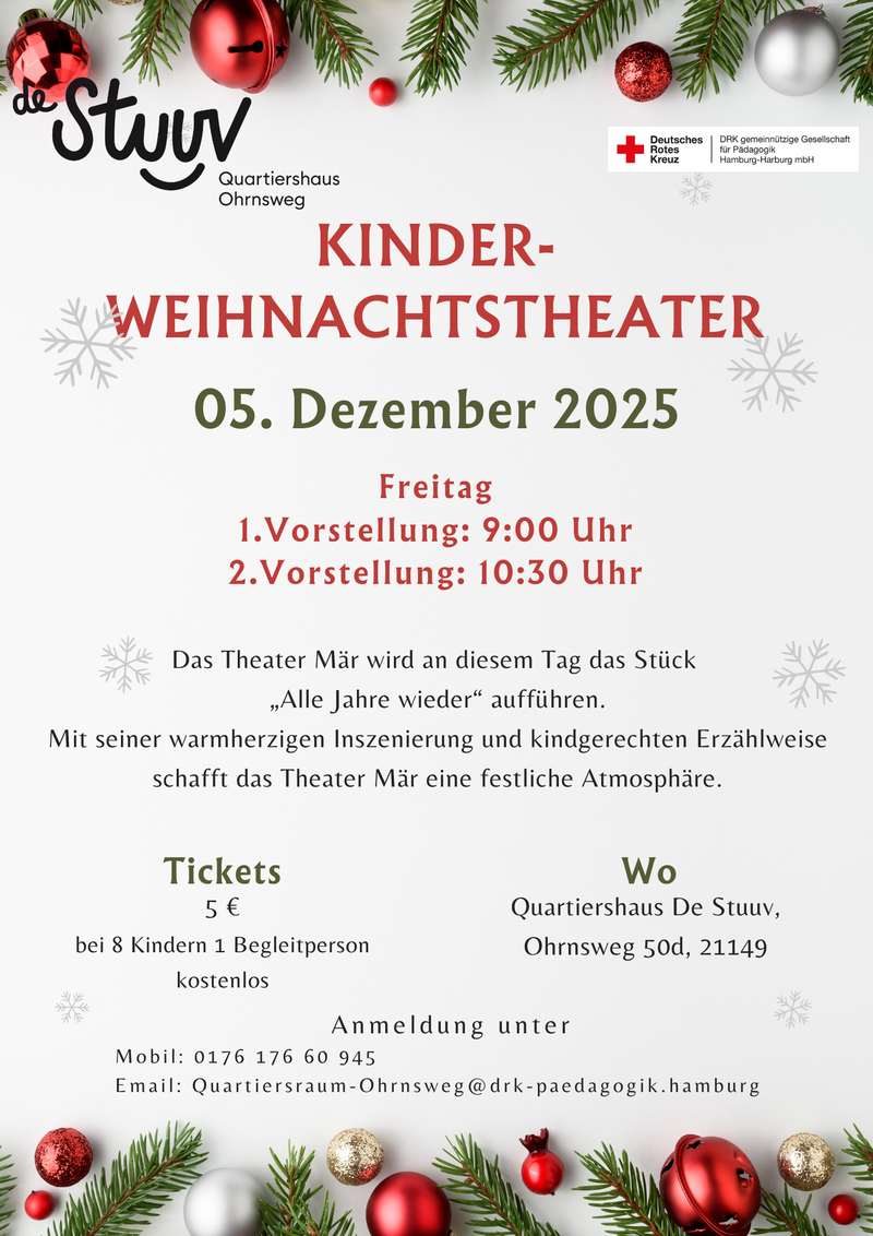 Das Theater Mär wird an diesem Tag das Stück „Alle Jahre wieder" aufführen. Mit seiner warmherzigen Inszenierung und kindgerechten Erzählweise schafft das Theater Mär eine festliche Atmosphäre.